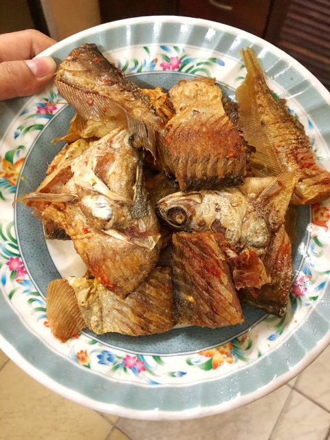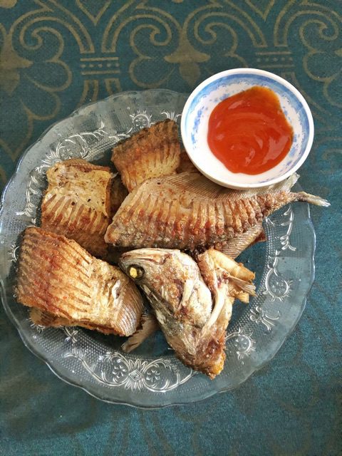 Món cá thác lác rút xương chiên giòn được ăn kèm với cơm, sử dụng nước chấm chua ngọt vừa vặn.